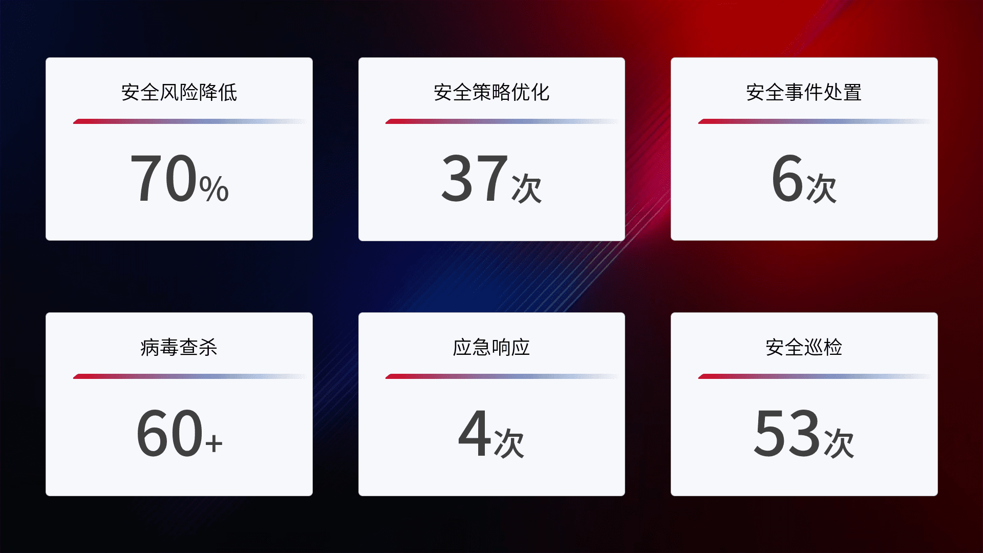 提供全面的安全事件报告体系,,包括处置报告、、、周报、、季度和年度总结,,结合持续监控,,,,帮助客户深入了解网络安全状况。。。